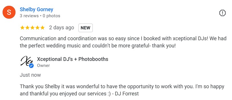 “Communication and coordination was so easy since I booked with Xceptional DJs! We had the perfect wedding music and couldn’t be more grateful—thank you!”